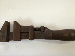 The ancestry of this wrench can be traced back to English coach wrenches which existed in the 18th century. At this time, standard sizes of nuts and bolts did not exist, so a set of fixed size wrenches would have been useless. The simplest examples had a movable jaw set with a wedge. But in some, the shank of the wrench would be threaded, and the handle would turn, acting as the nut to move the jaw back and forth1. These had the disadvantage that they could not be adjusted with one hand, and could also be loosened accidentally while pulling on them, which would have been a very frustrating experience.