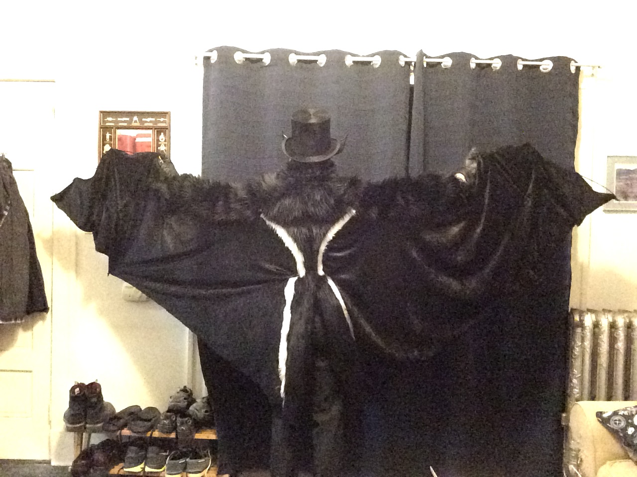 Then, in 2013 I saw this article showing a new species of bat discovered in South Sudan, called Niumbaha Superba. This gave me an idea for another variation on the same costume. The colors of the bat suggest something like a tuxedo, or a tailcoat. To me the bat looks like it’s dressed up in a fancy evening costume. This year for Halloween 2015 I decided to replicate the look.