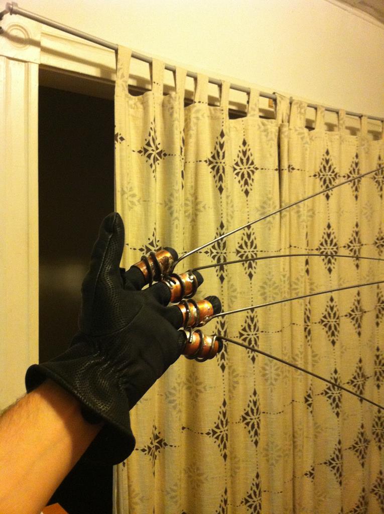 The idea was simple: the body of the bat would be a sort of tunic made of synthetic fur. To this would be attached wings of a lightweight fabric, in this case velour. Gloves fitted with finger extensions made of wire would be attached to these wings to give them the necessary structure. This was also the first time I had sewn anything of any size but my friend set me up with a sewing machine and a serger and showed me how to do the appropriate stitches. I ordered all my fabric from Distinctive Fabric. The finger extensions themselves were made of 1/8” steel wire silver soldered to ½” copper pipe couplers.