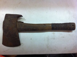 At the January cruft swap, there were old-timey snowshoes, broken laptops, and a milk crate full of rusty tools. I picked them up one after the other. I kept coming back to the axe. I put it down, thinking I would never need it. But its shape is so naturally suggestive of its function that simply picking it up seems to imbue the holder with magic lumberjack powers. Like suddenly growing fins out of your back would make you want to go for a swim. I picked it up again.